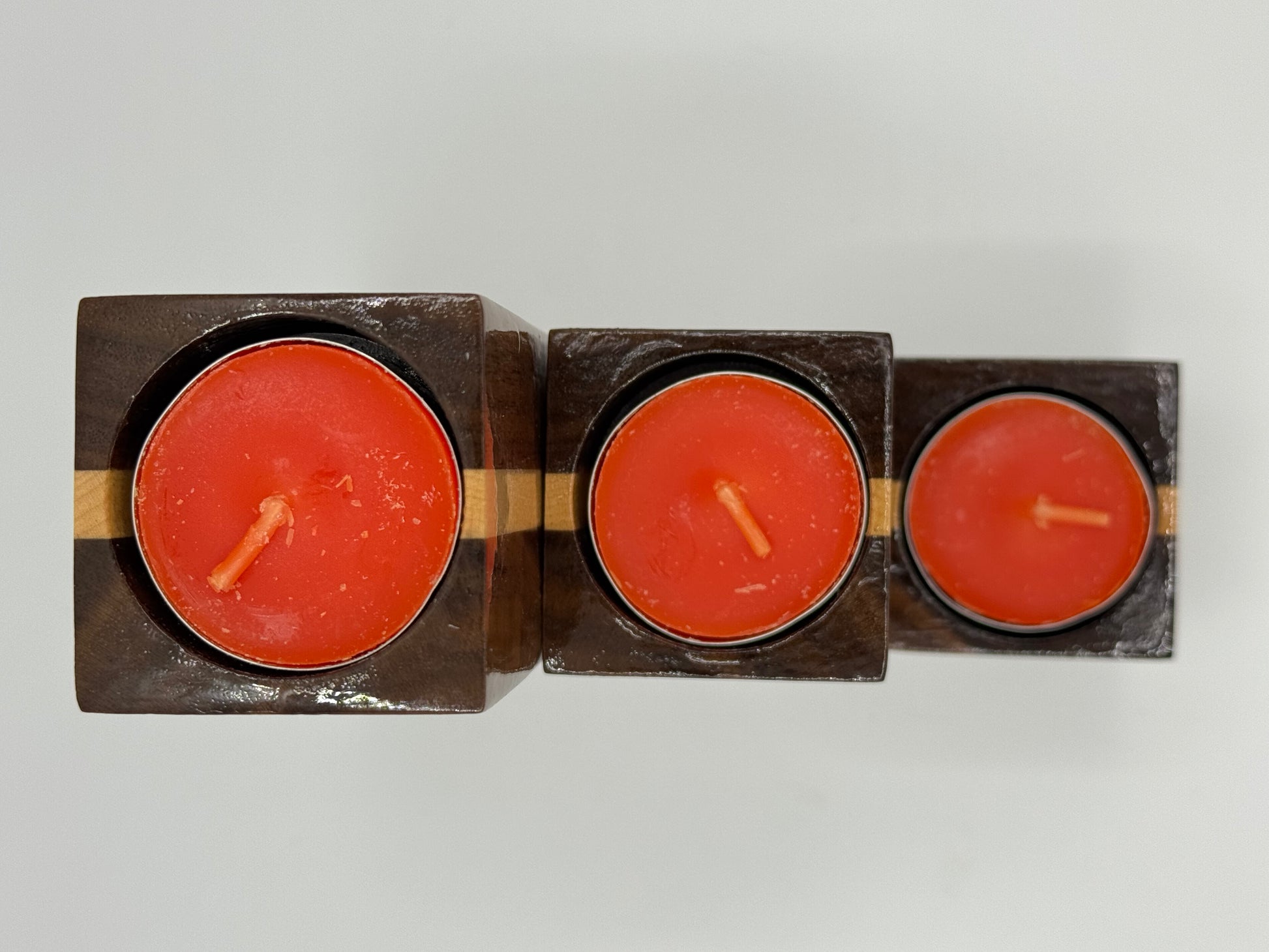 Elevate your space with this elegant set of three candle holders, crafted from rich walnut wood. Each 50mm square holder comes in three varying heights (50, 100, and 150 mm), creating a striking visual rhythm. The delicate maple dividing strip adds a refined contrast, highlighting the natural beauty of the wood. Perfect for adding warmth and style to any room, this set blends craftsmanship with timeless design.